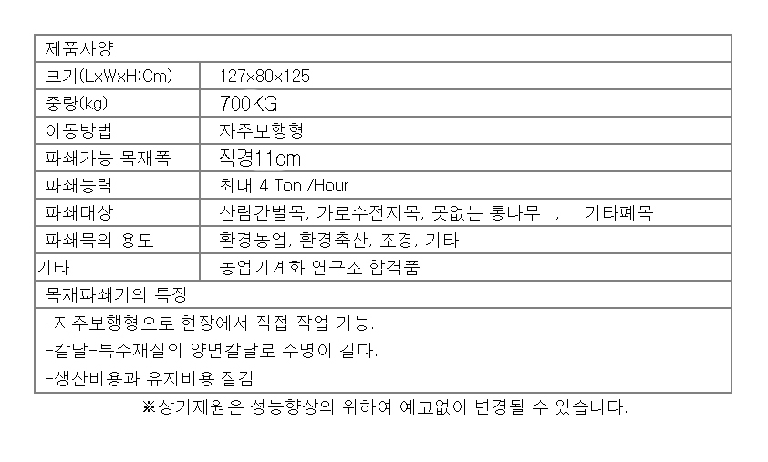 - 중량 700KG (1톤트럭상차가능)