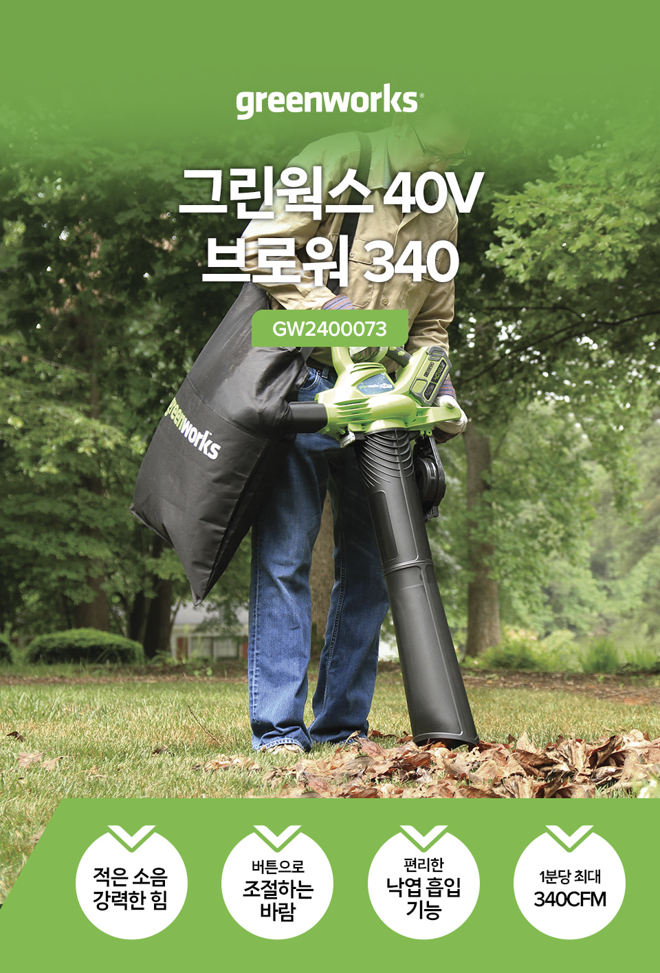 [그린웍스]40V 충전식 브로워 340 GW2400073/VAC(본체/배터리1팩/배터리2팩)
