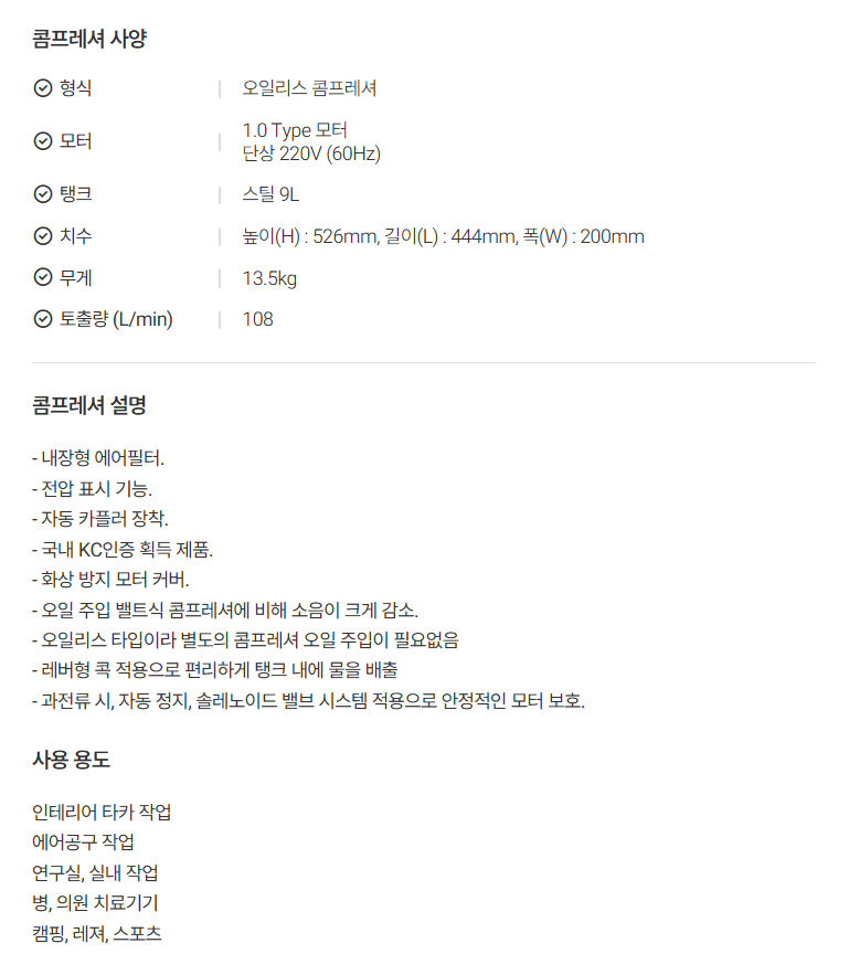 [제일타카] 저소음 스틸 콤프레샤 JQS109/550W(1Hp)