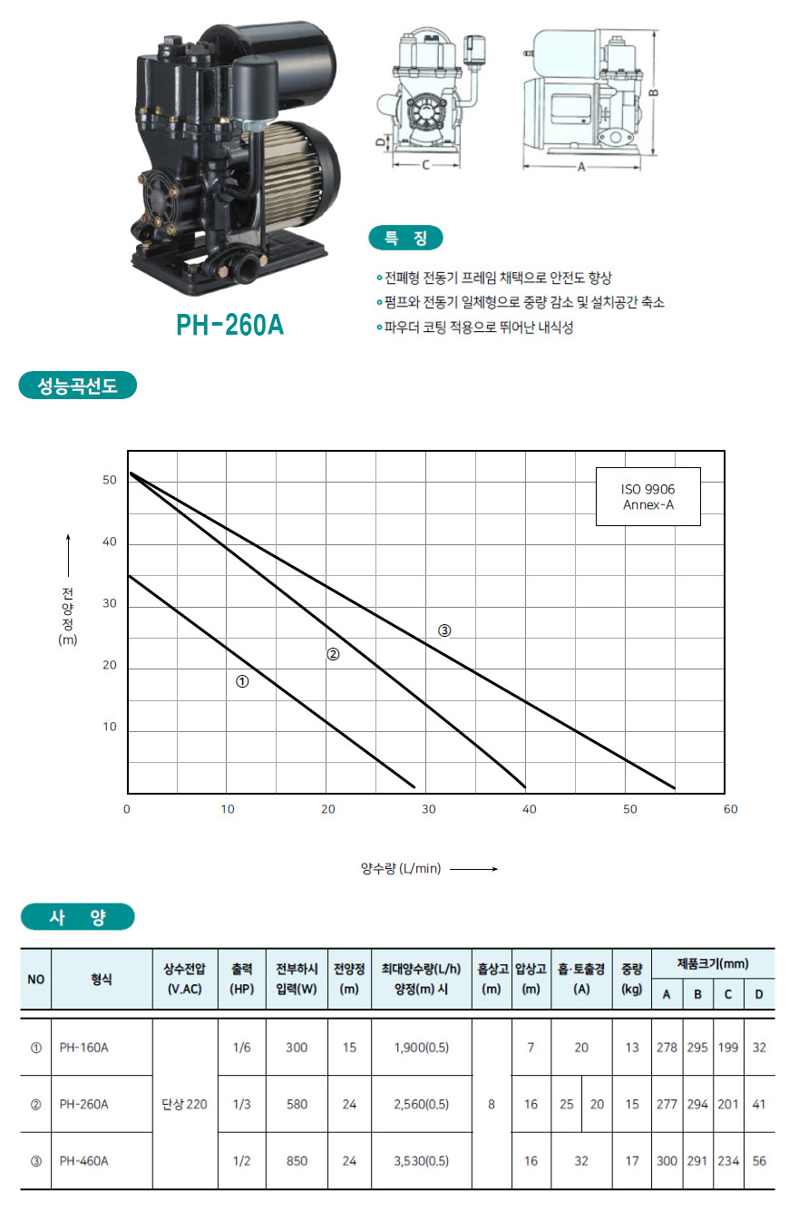 PH-260A 압상 16m 흡상 8m 1/3HP 1P 220V 자흡 자동펌프25/20A