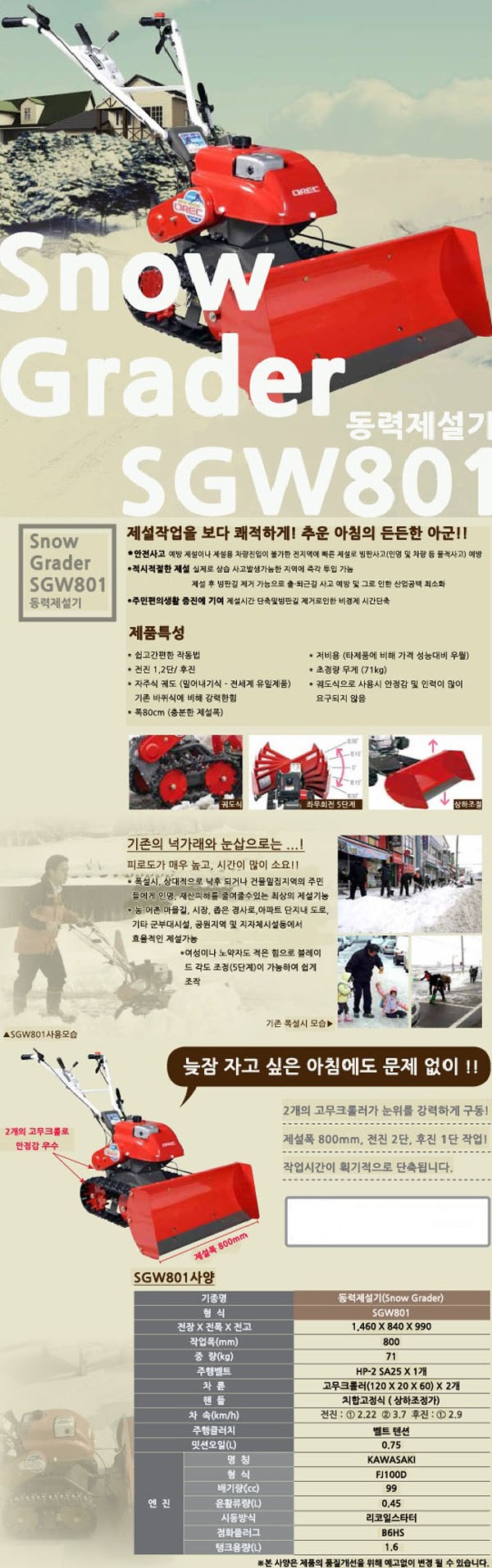 [오렉]일본완제품 궤도형 제설기/스노우그레이더/가와사키엔진/SGW801/K