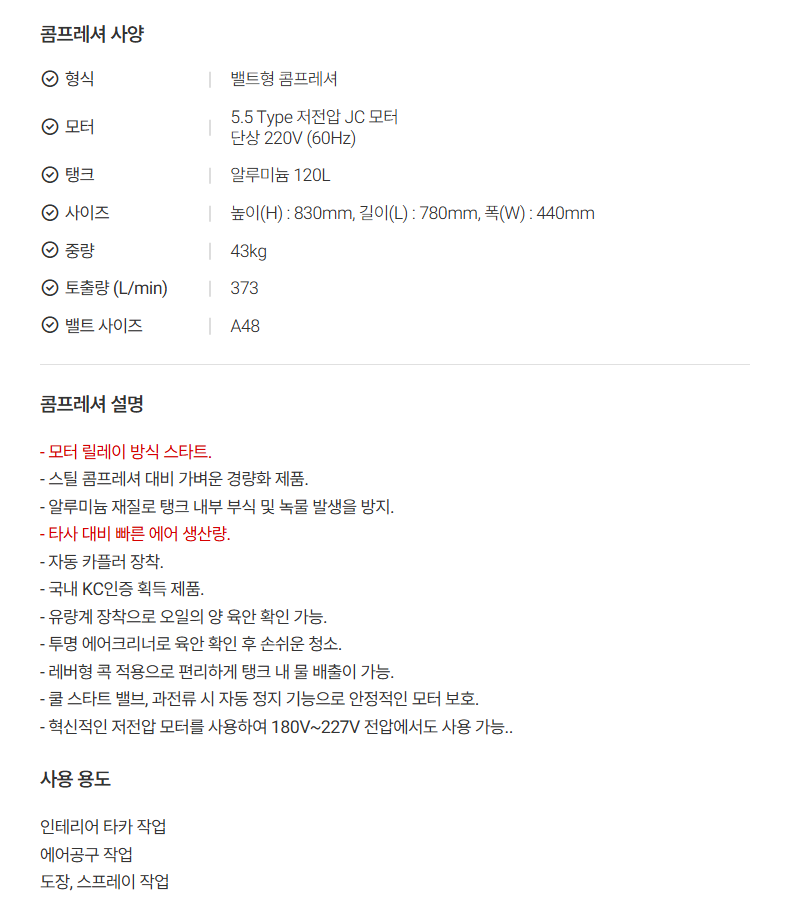 [제일타카] 밸트형 콤프레샤 JCA60-120(6.5Hp)
