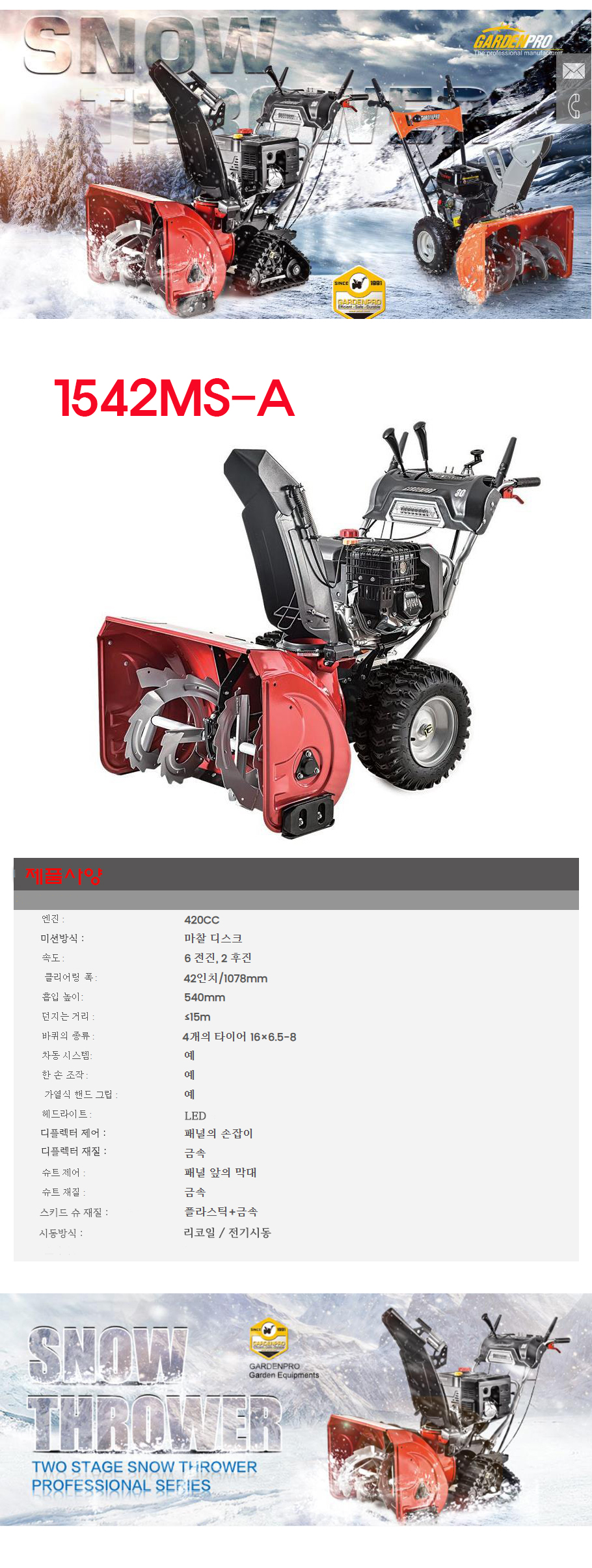 [가든프로]대형 광폭제설기15HP/420cc/제설폭107cm/1542MS-A/스노우타이어 4륜장착형