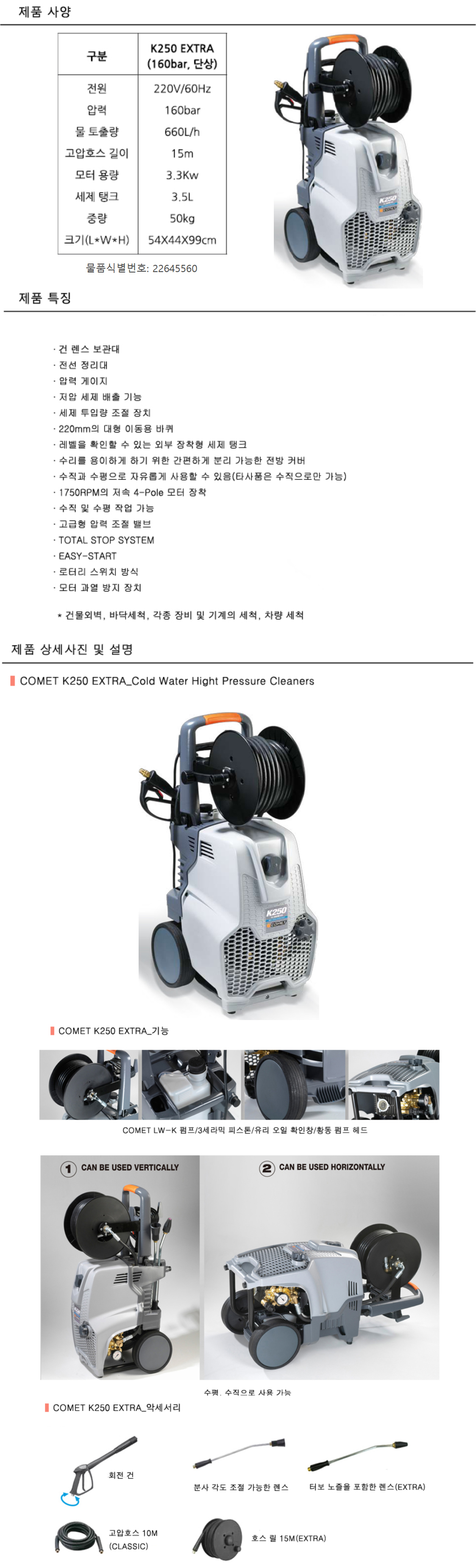 [코메트] 냉수 고압세척기 K250 EXTRA (160bar,660ℓ/h)-단상
